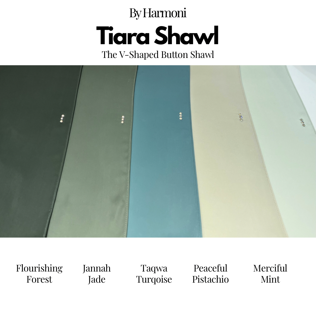 Tiara Shawl In Flourishing Forest, Jannah Jade, Taqwa Turqoise, Peaceful Pistachio, Merciful Mint