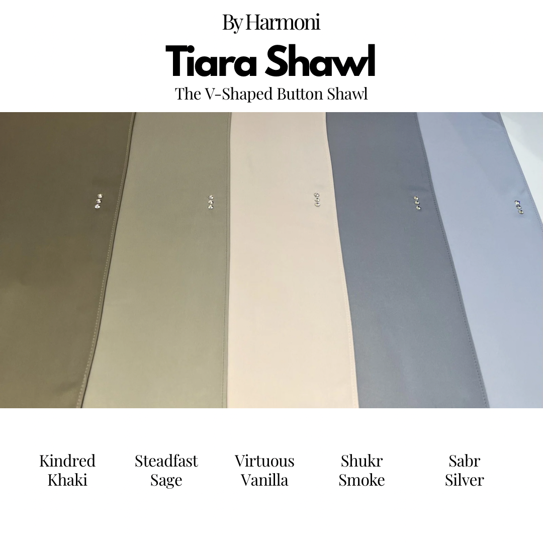 Tiara Shawl In Kindred Khaki, Steadfast Sage, Virtuous Vanilla, Shukr Smoke, Sabr Silver